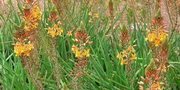The evergreen perennial cactus or succulent Bulbine frutescens has green leaves but yellow and orange blossoms appear in the spring and summer. It is a great addition to pollinator gardens since it draws hummingbirds and bees. It thrives under regular, low watering and sun-dappled shade. These plants are beautiful and if you want one, we have them!